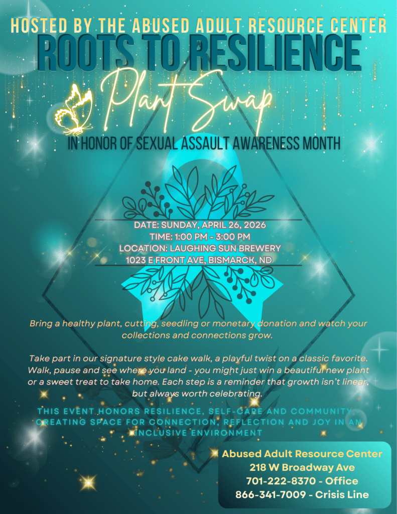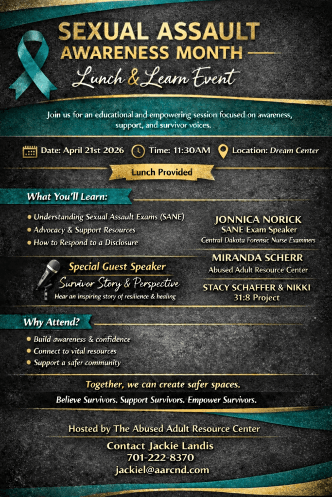 The Abused Adult Resource Center (AARC) has been helping survivors of domestic violence and sexual assault for more than 40 years. Serving south central North Dakota, we provide emergency support, crisis intervention, temporary shelter, food, counseling, and advocacy to survivors of domestic violence, sexual assault, and human trafficking.